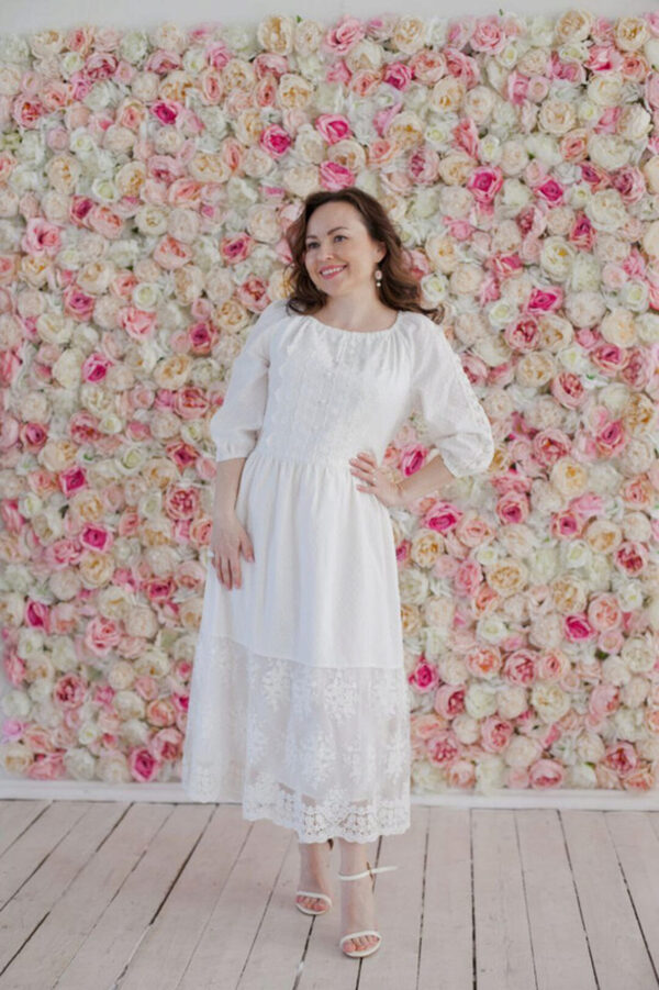 Платье полуприлегающего силуэта. Нагрудные и плечевые вытачки переведены в горловину. Прилегание за счёт талиевых вытачек по переду и спинке. Рукав реглан. Вырез на кулиске, со сборкой, которая образуется за счёт стягивания шнурком. Середина лифа и рукава украшения кружевом. Юбка на сборке в области талии. Низ юбки из кружева. Платье на подкладке.