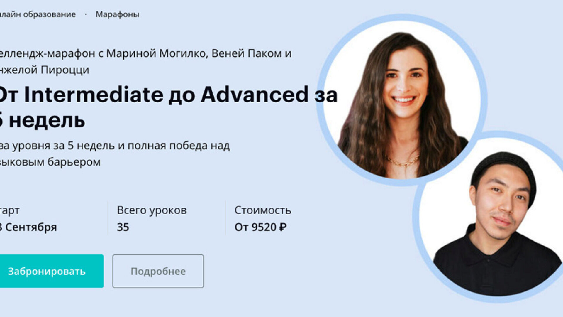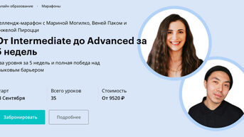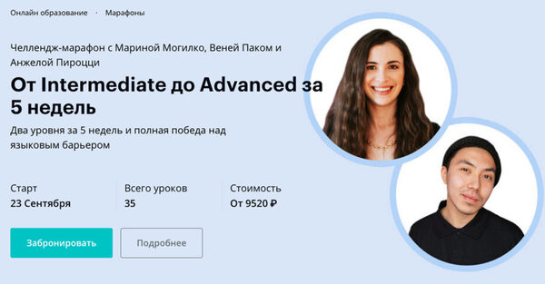 Что даст марафон: Чёткая система Поставите на ноги свой шаткий английский и обретёте уверенность в своих знаниях. Долой языковой барьер Узнаете, как его преодолеть и разговаривать легко хоть с премьер-министром. Нескучные уроки На марафоне не бывает зубрёжки, Веня с Мариной рассказывают так, что