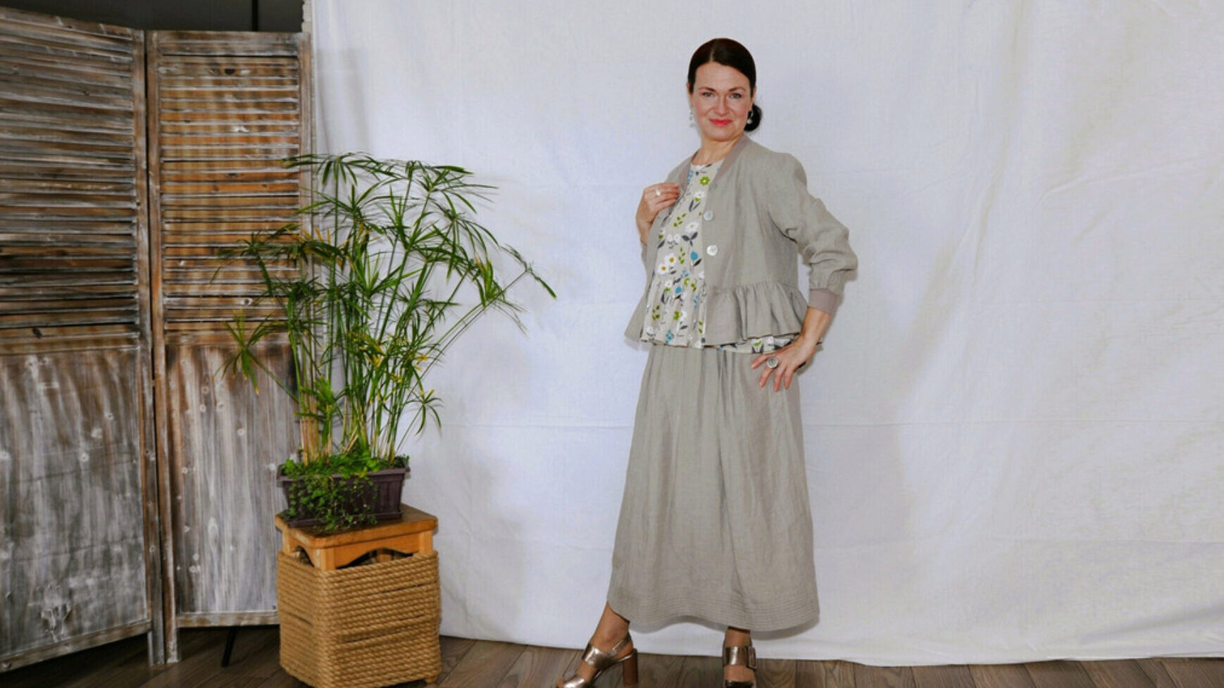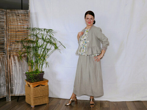 Жакет из цвета натурального льна имеет нагрудную вытачку, втачной рукав, горловина и низ рукава обрабатываются кашкорсе, обильная сборка баски, цельнокройный бортик, подкладка по полочке и спинке жакета, застёжка на пуговицах + петля в шве по линии талии.