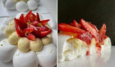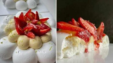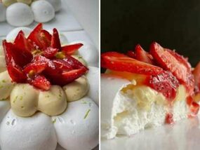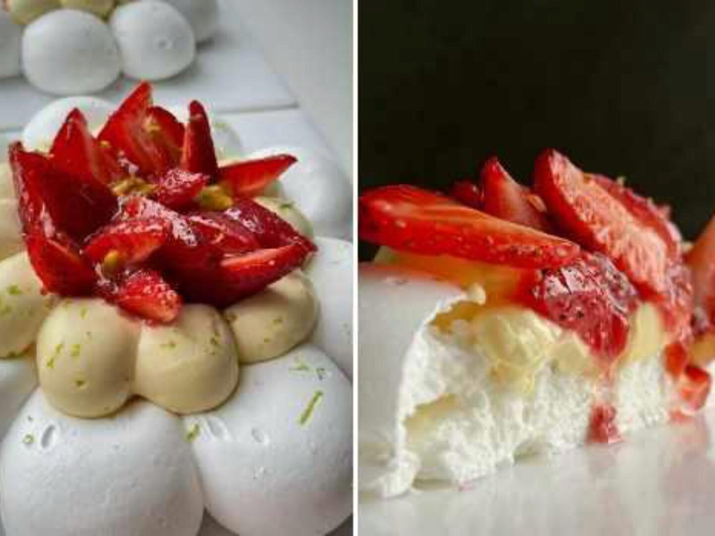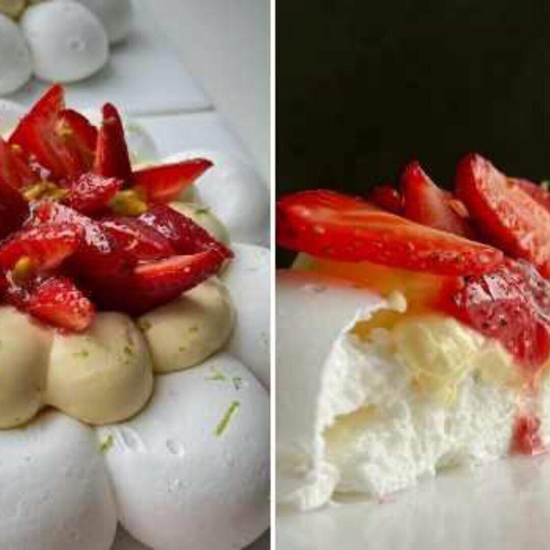 - Десерт «Павлова» с лаймовой меренгой с тонкой сахарной корочкой и воздушным суфле внутри, клубничной начинкой, взбитым ганашом из маракуйи, сливок и шоколада