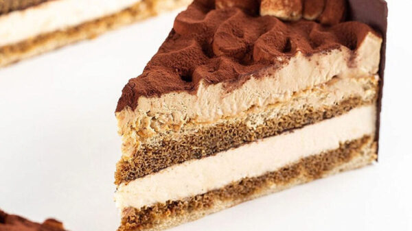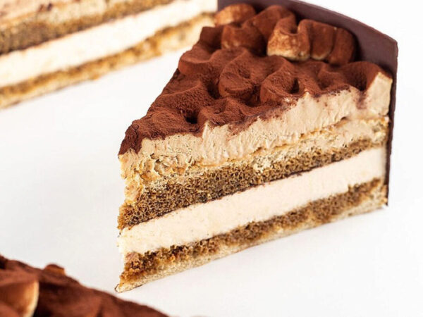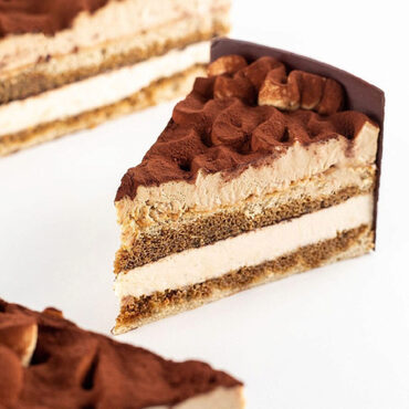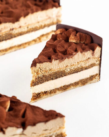 Миндальный бисквит, шоколадное кремё с бобами тонка, Карамельный крем с Маскарпоне, Мусс Мокко.