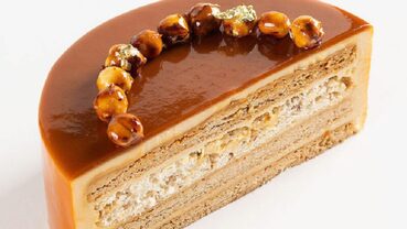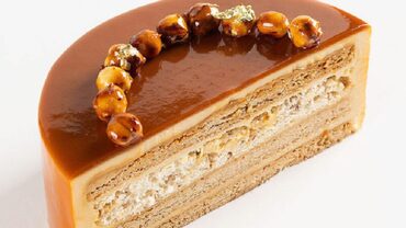 Миндальный бисквит, шоколадное кремё с бобами тонка, Карамельный крем с Маскарпоне, Мусс Мокко.