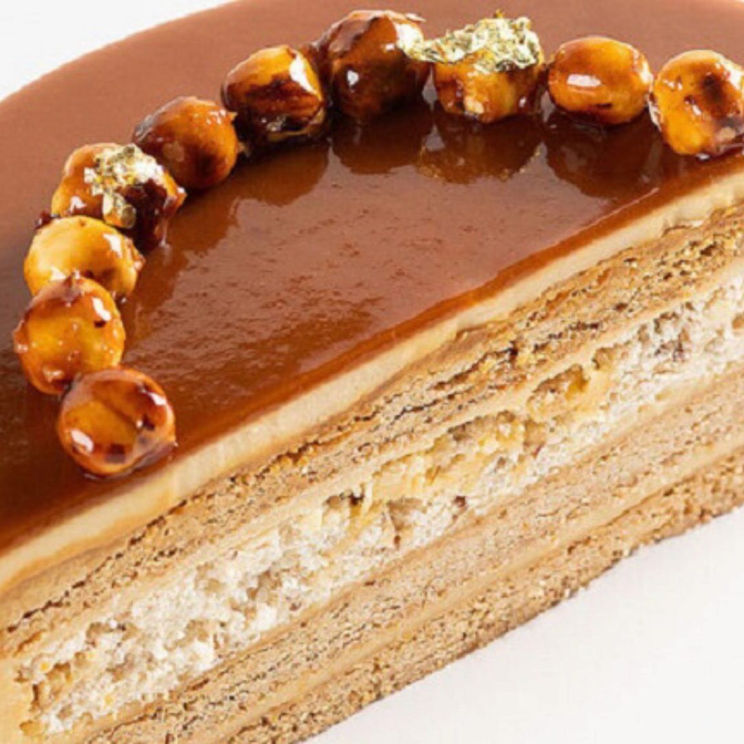 Новогодний торт Мусс с фундучным пралине Шоколадное креме Карамель щербет с орехом Фундучный бисквит Песочная рассыпчатая основа Муссовый орехово-шоколадный торт на хрустящей основе с нежной фундучной карамелью, сочным фундучным бисквитом, шоколадным креме и воздушным фундучным муссом на основе