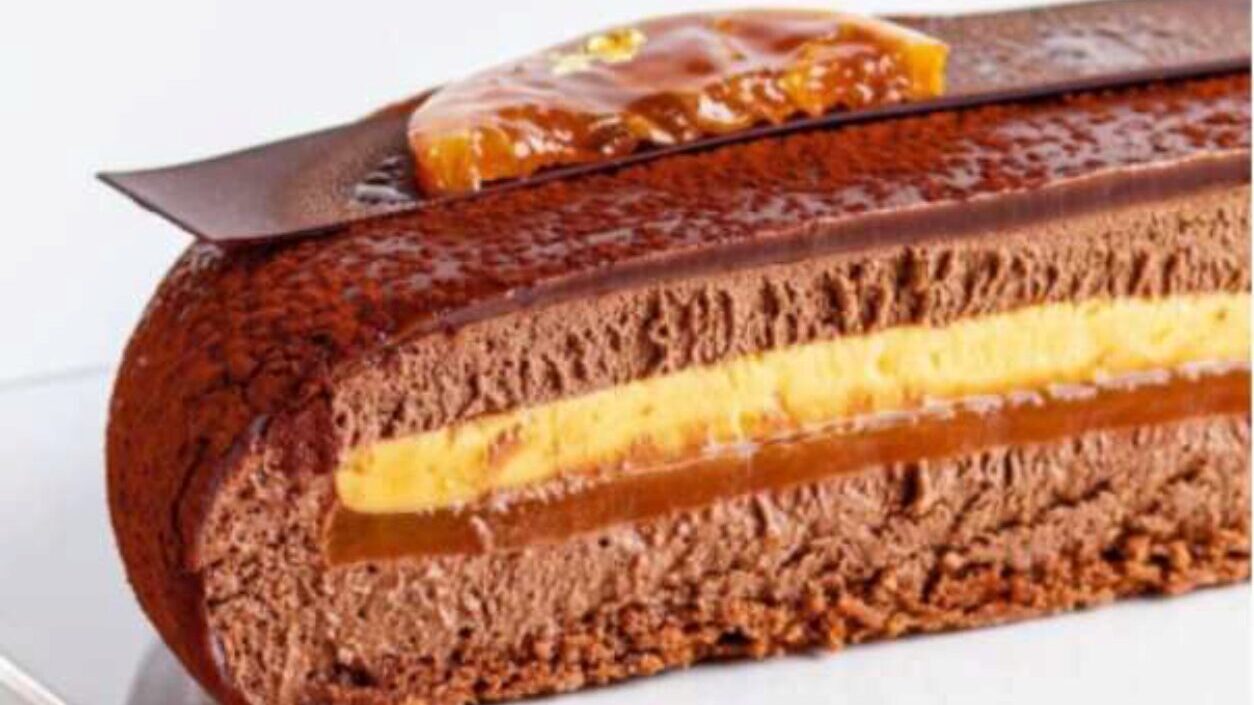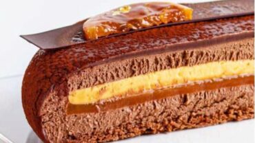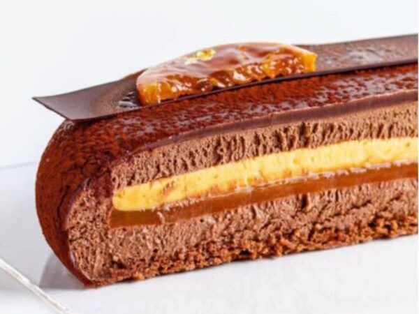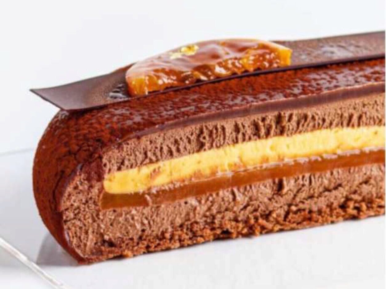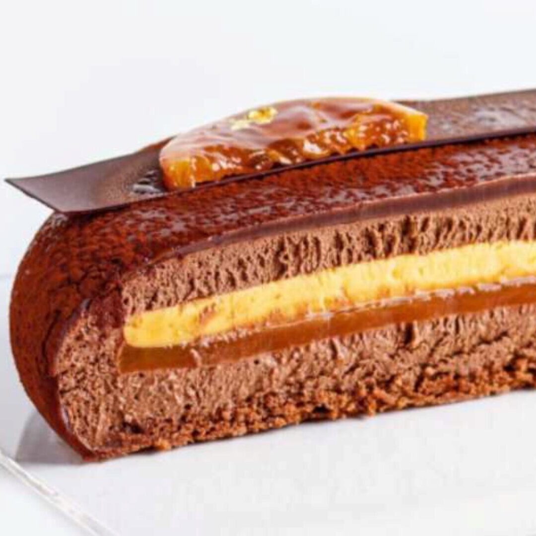 Торт состоит из миндально-шоколадного бисквита, шелкового шоколадного мусса, начинки мандарин и креме из экзотической маракуйи.