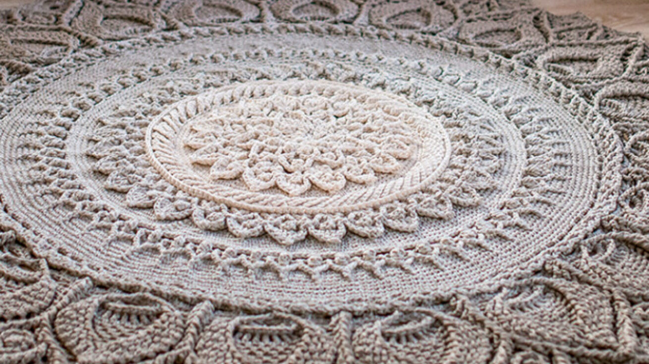 Видео мастер-класс на ковер «LacePeacock» («Павлин») Из полиэфирного шнура 5мм с сердечником: размер ковра ≈316х214см вяжется крючком 10мм расход шнура ≈4000м Из полиэфирного шнура 4мм без сердечника: размер ковра ≈215х142см вяжется крючком 7мм расход шнура ≈2900м Из салфеточной пряжи: 1) размер
