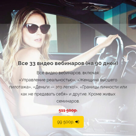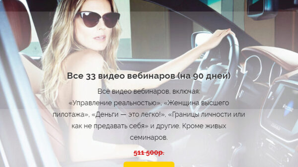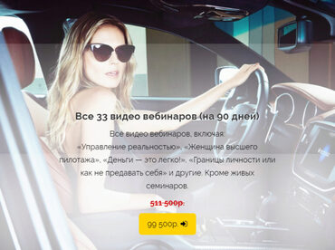 Входят такие вебинары: 1) Искусство общения с мужчиной в период первых свиданий, первого секса и поведения после него 2) Карта желаний. Практика манифеста 3) Границы личности или как не предавать себя 4) Материнский инстинкт или тревога? Идеальная и плохая мать 5) Новая Я 6) Воспитание детей