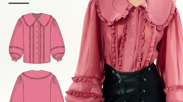 Выкройка блузки большого объема, прямого силуэта. На детали спинки расположена двойная кокетка, переходящая на деталь полочки. Под кокеткой на спинке расположена встречная складка. Воротник рубашечный отложной на стойке. Застежка планка центральная на прорезные петли и пуговицы. Линия плеча