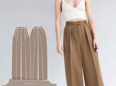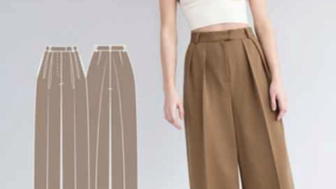 Выкройка брюк большого объема, прямого силуэта, вида «палаццо». На передних и задних половинках заутюжены стрелки. По линии талии на передних половинках заложены по две односторонние мягкие складки, направленные в сторону гульфика. На задней половинке – талиевые вытачки. В боковых швах