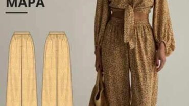 Выкройка брюк прямого силуэта, большого объема. В боковых швах функциональные карманы. Пояс широкий притачной, с эластичной тесьмой внутри. Тесьма закреплена в поясе двумя строчками. Верхний край пояса расположен на естественной линии талии. Длина брюк ниже уровня щиколоток. Примерное время пошива