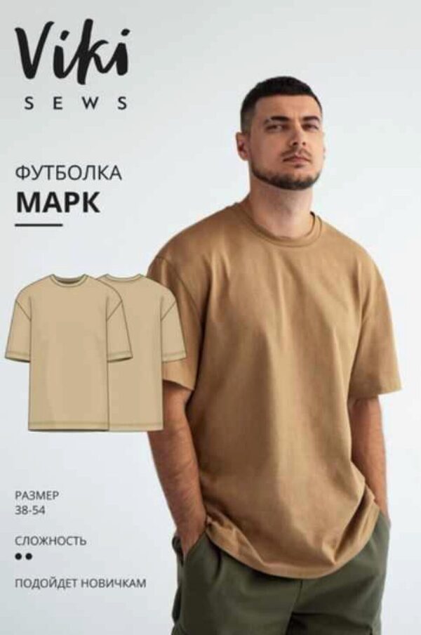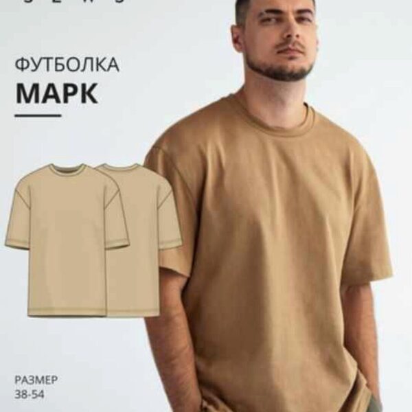 Выкройка мужской футболки большого объема, прямого силуэта. Линия плеча спущенная. Рукав втачной, короткий. Вырез горловины круглый, обработан бейкой. Длина футболки до линии бедер. Примерное время пошива – 1 день.