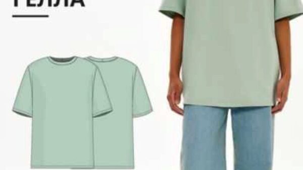 Выкройка футболки большого объема. Вырез горловины округлый с вставкой из кашкорсе. Рукав покроя реглан, свободный, длиной выше локтя. Длина футболки до линии бедер. Для пошива футболки подойдут трикотажные полотна, которые обладают следующими свойствами: - плотные или средней плотности,