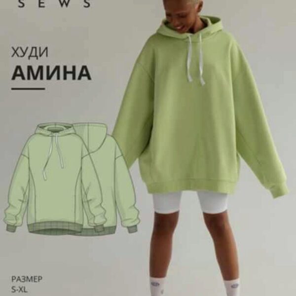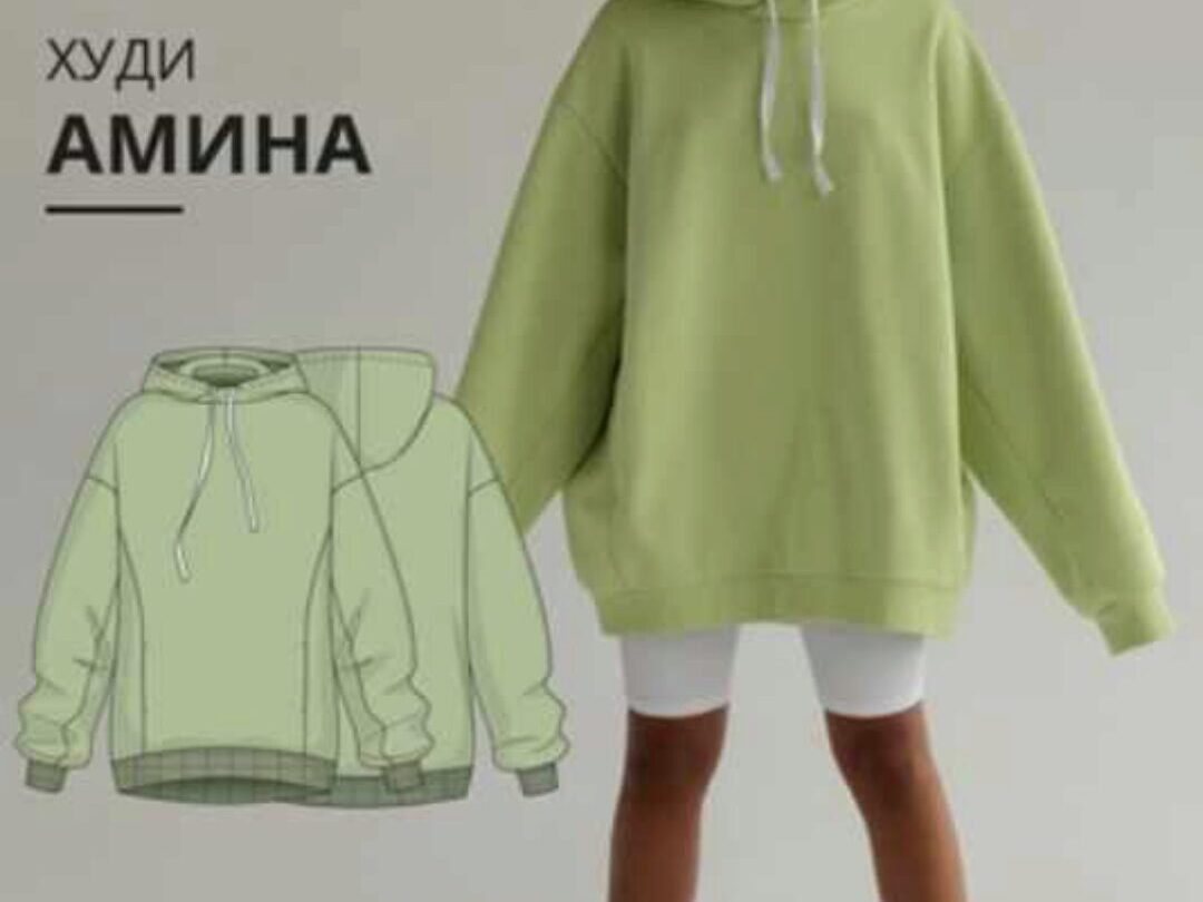 Выкройка худи большого объема, прямого силуэта, с капюшоном, оверсайз. Деталь переда имеет вертикальные подрезы, в которых обработаны внутренние карманы. Линия плеч спущенная. Рукав рубашечного покроя, содержит два декоративных шва, по низу рукава притачная манжета. Капюшон объемный, со швом, по