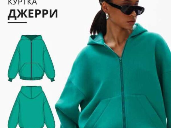 Выкройка куртки большого объема, прямого силуэта, с капюшоном. Изделие может быть выполнено как на подкладке, так и без нее. На полочках расположены накладные карманы. Рукав рубашечный, длинный, большого объема. По низу рукавов притачные манжеты. Капюшон умеренного объема, со швом. Застежка на