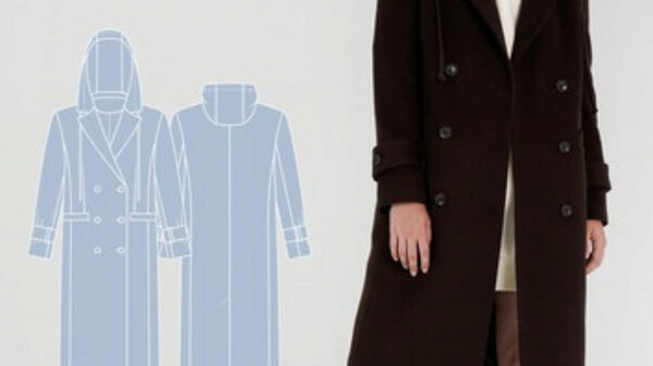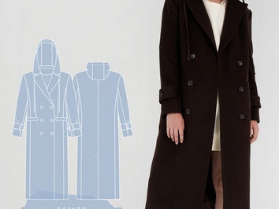 Выкройка пальто большого объема, прямого силуэта. Пальто с цельнокроеным капюшоном. Нагрудная вытачка на полочке переведена в горловину. На полочках расположены накладные карманы. Плечо спущенное, рукав рубашечный, одношовный. Пальто без застежки. Выполнено из двухслойной ткани, без подкладки. У