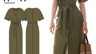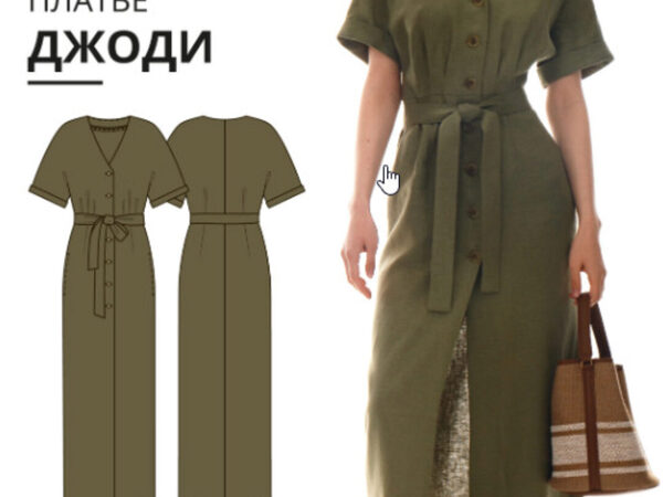 Выкройка платья умеренного объема, силуэта трапеция. Вырез горловины округлой формы, обработан обтачкой. На переде платья нагрудные вытачки. В боковых швах платья карманы. На детали спинки средний шов с застежкой на потайную молнию. Длина платья выше щиколотки. Примерное время пошива – 1 день (8