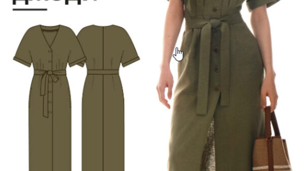 Выкройка платья прямого силуэта, большого объема, с подрезом фигурной формы, ниже линии груди. Вырез горловины глубокий V-образный на запах. Верхняя часть спинки со средним швом. Нижняя часть платья со сборкой по подрезу. Рукав цельнокроеный, длинный, по низу собран на резинку. Длина платья ниже