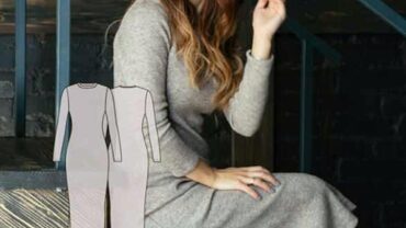 Выкройка платья прямого силуэта, большого объема, с подрезом фигурной формы, ниже линии груди. Вырез горловины глубокий V-образный на запах. Верхняя часть спинки со средним швом. Нижняя часть платья со сборкой по подрезу. Рукав цельнокроеный, длинный, по низу собран на резинку. Длина платья ниже