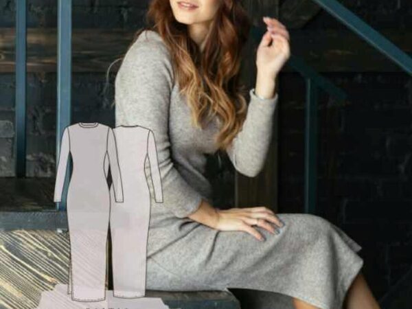 Выкройка платья умеренного объема, силуэта трапеция. Вырез горловины округлой формы, обработан обтачкой. На переде платья нагрудные вытачки. В боковых швах платья карманы. На детали спинки средний шов с застежкой на потайную молнию. Длина платья выше щиколотки. Примерное время пошива – 1 день (8
