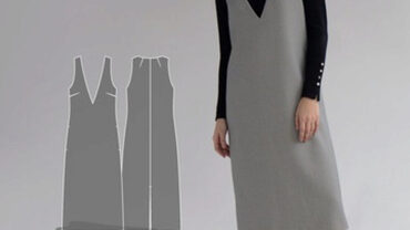 Выкройка платья малого объема, прилегающего силуэта. Вырез горловины глубокий, округлой формы, обработанный бейкой с открытым срезом. Нижняя часть платья расширена книзу. Рукав длинный, малого объема, втачной, одношовный, расширенный книзу, с отверстием в нижней части рукава. Нижний срез рукава