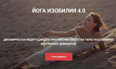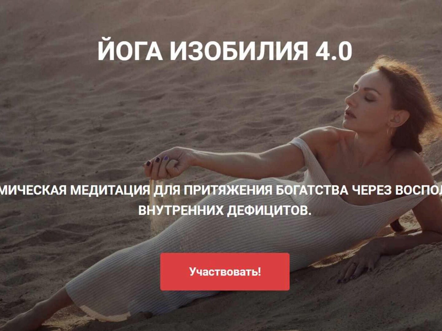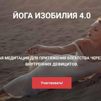 Йога изобилия 3.0 - авторская методика для быстрого обогащения, которая позволяет очень быстро запрограммировать своё подсознание на богатство, изобилие и реально изменить финансовую ситуацию в своём кошельке. Первые две версии Йоги изобилия, которые существуют с 2013 года прошли уже более 5000