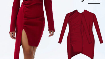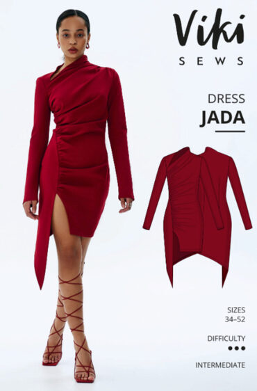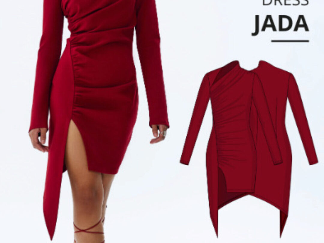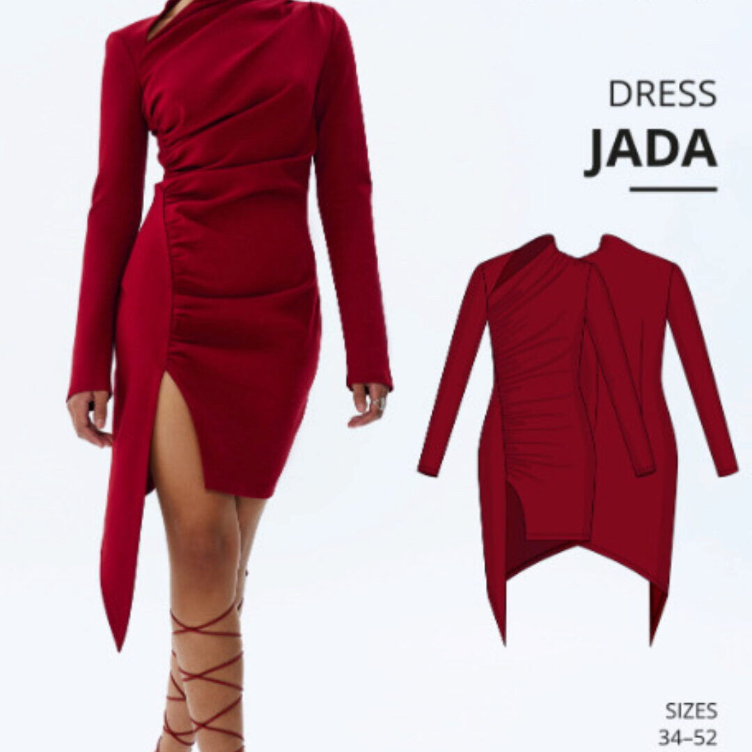 Jada – облегающее платье с асимметричной драпировкой и разрезом спереди. Плотная посадка достигается за счет вытачек на талии сзади. Присборенный левый плечевой шов и стойка воротника образуют асимметричный вырез горловины, дополненный кокеткой с правой стороны. Платье имеет длинные прямые втачные цельнокроенные рукава и фигурный низ. Джада имеет длину выше колена.