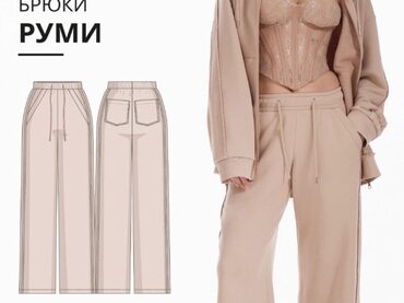 Выкройка брюк прямого силуэта, большого объема. В боковых швах функциональные карманы. Пояс широкий притачной, с эластичной тесьмой внутри. Тесьма закреплена в поясе двумя строчками. Верхний край пояса расположен на естественной линии талии. Длина брюк ниже уровня щиколоток. Примерное время пошива