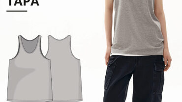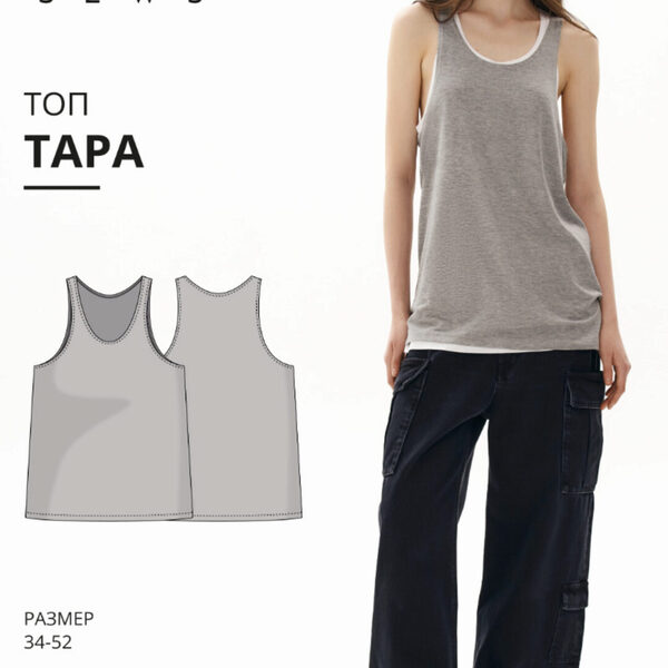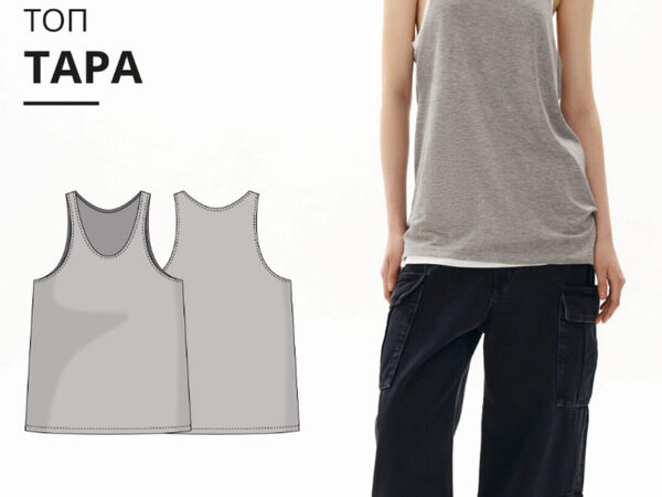 Выкройка топа малого объема, прилегающего силуэта. У топа горловина округлой формы, обработанная бейкой. Топ без рукавов, американская пройма обработана обтачкой. Длина до линии бедер. Для пошива топа подойдут трикотажные полотна, которые обладают следующими свойствами: - мягкие, растяжимые и
