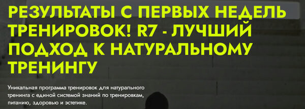 Уникальная программа тренировок для натурального тренинга с единой системой знаний по тренировкам, питанию, здоровью и эстетике для достижения тела своей мечты. В R7 используются определенные комбинации упражнений для чередования мышечных групп. Подбирается количество повторений, подходов, отдыха