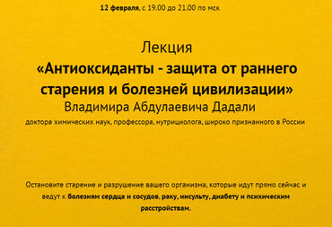 Приглашаем Вас на авторский курс по нутрициологии В. А. Дадали «Питание и здоровье. Применение микронутриентов и других природных соединений в профилактике и оздоровлении». Курс проходит в режиме on-line и транслируется через интернет. Обратите внимание что этот курс проходит в живую (онлайн) и