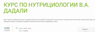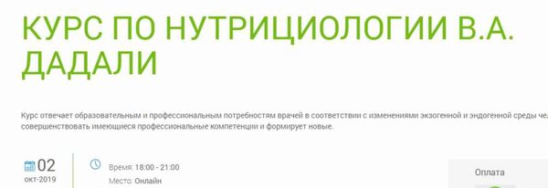 Приглашаем Вас на авторский курс по нутрициологии В. А. Дадали «Питание и здоровье. Применение микронутриентов и других природных соединений в профилактике и оздоровлении». Курс проходит в режиме on-line и транслируется через интернет. Обратите внимание что этот курс проходит в живую (онлайн) и