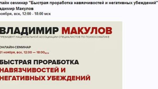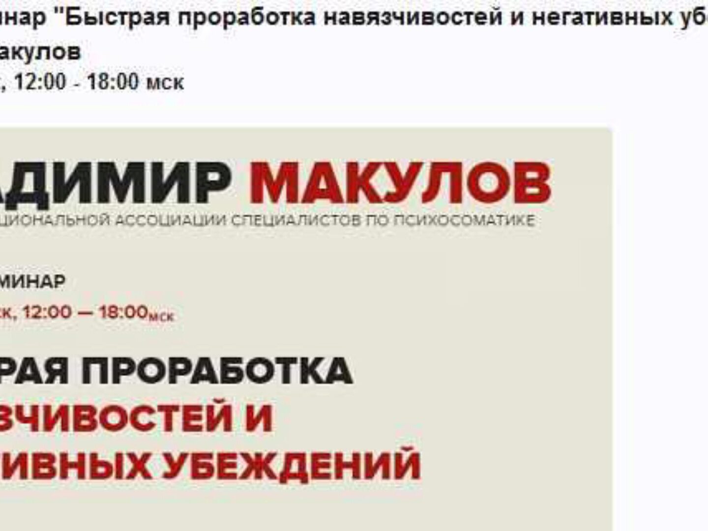 Владимир Макулов 05 января, среда, 12:00 - 18:00 мск ! Обновленный семинар, НЕ повтор ! Темы: Новая структура формирования невроза Принципы работы навязчивостей и негативных убеждений Подготовка к проработке Отключение навязчивостей и остановка внутреннего диалога Изменение негативного убеждения