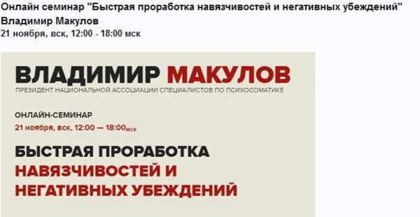 ЧТО ВЫ ПОЛУЧИТЕ пройдя онлайн-версию нашего семинара «Проработка психосоматики по методу Владимира Макулова» Проработаете все свои текущие проблемы и поймёте как они появляются Научитесь прорабатывать других и зарабатывать на этом достойные деньги Начало 17 сентября 2022