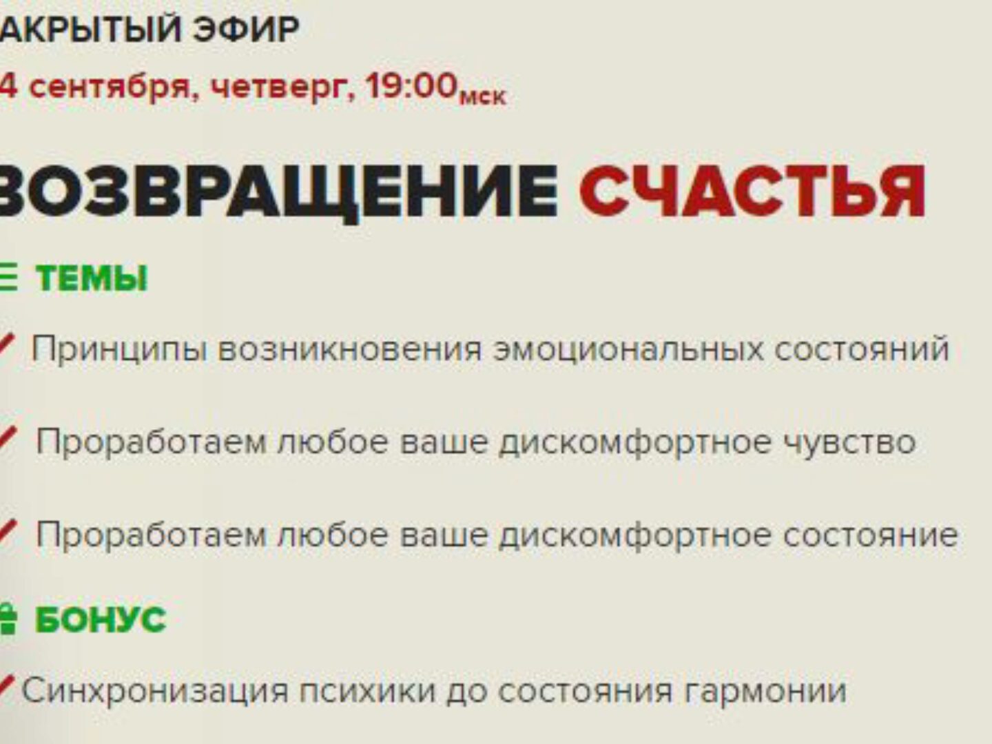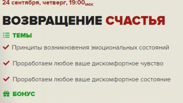 На этот раз я модифицировал Метод Макулова и создал процесс который за полчаса меняет ваше состояние на более спокойное, радостное, удовлетворенное. При желании вы потом сможете пересматривать запись эфира и возвращать его себе снова.