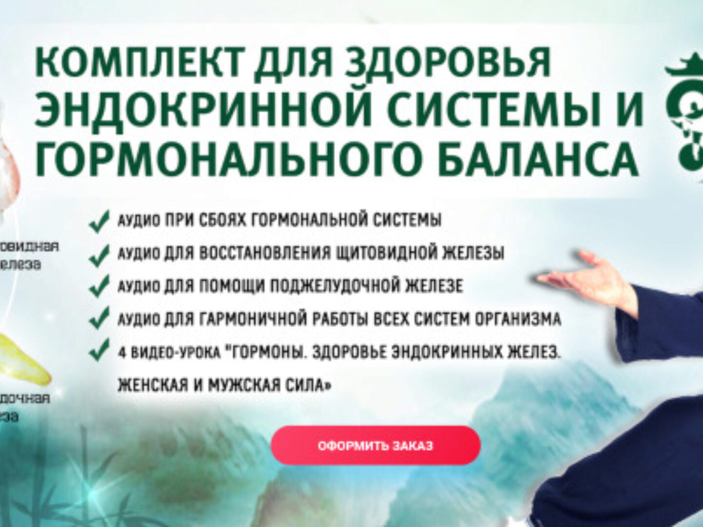 Программа курса: Точечный массаж при зобе, узлах и новообразованиях в щитовидной железе Дыхание Цигун для восстановления щитовидной, паращитовидной и вилочковой железы Динамическая релаксация для восстановления щитовидной, паращитовидной и вилочковой железы Медитация «Свет Неба» — питание головного