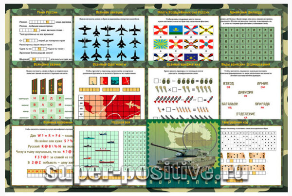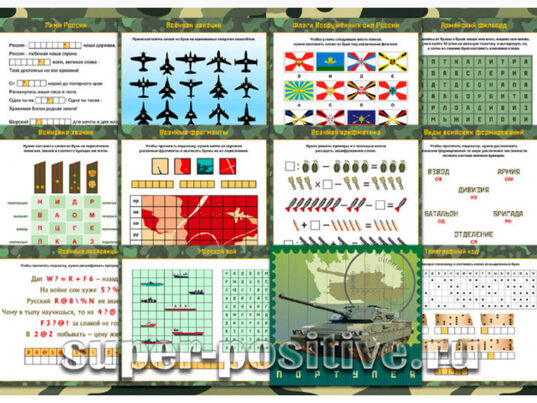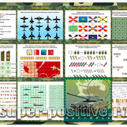 - Готовый набор красочно оформленных заданий поможет провести квест на военную тематику или интересно обыграть вручение подарка на 23 февраля.