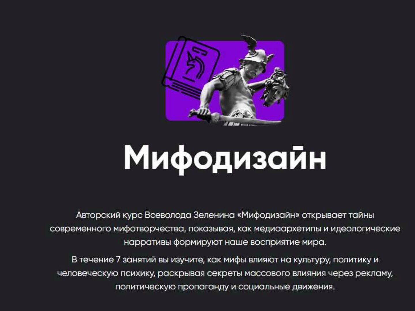 Авторский курс Всеволода Зеленина «Мифодизайн» Наш мир — арена мифодизайна, где каждая история, каждый образ, который мы воспринимаем, является звеном большой игры воображения и влияния. Управляя нами каждую минуту, незаметно и мастерски, современные мифодизайнеры — архитекторы нашего восприятия