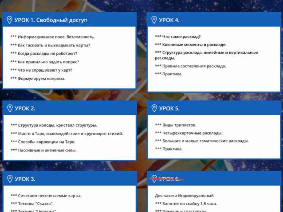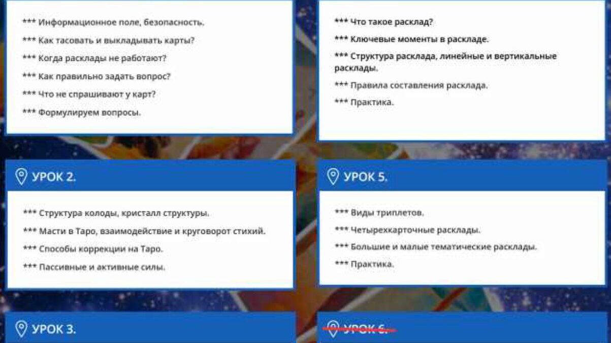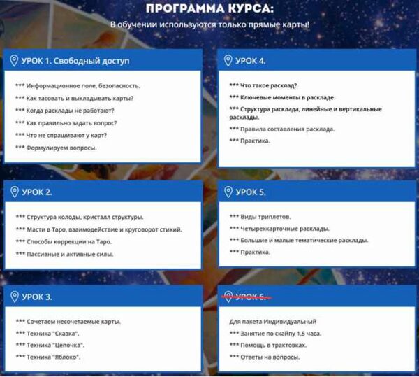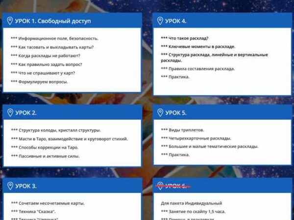 Курс полный, состоит из 6 блоков: 2 блока-СА 2 блока-МА 1 блок- мастер-группа 1 блок- расклад на год К сожалению описания курса нет, так как курс проводился для учеников форума. Курс от хозяйки форума « Таро просто и понятно» (Е Степанова-Hellen)
