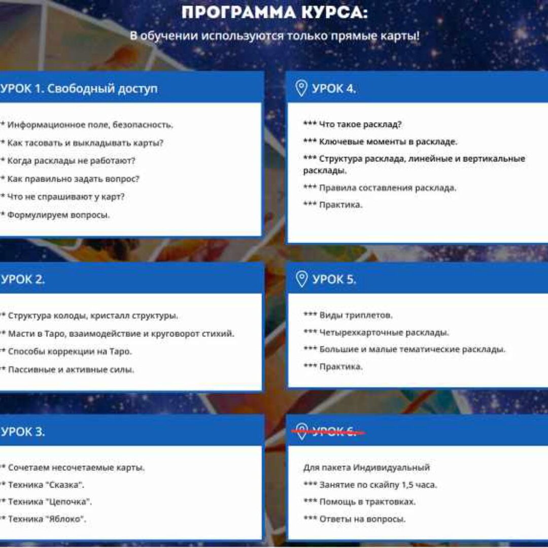 Каждый расклад таро - это гораздо больше, чем просто набор карт. Это пути нашей судьбы, это зеркало нашей души и отражение сознания. - Как научиться читать карты в полом созвучии? - Как научиться видеть всю картину целиком? - Как распознавать детали и понимать истинные мысли и чувства? В программе