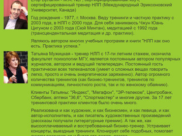В один из дней тренинга Вы вдруг заметите, что мир перестал быть таким, как прежде... он стал таким, каким его создают Ваши мысли. Это как сон наяву, как Матрица, которой Вы управляете, как сказка сошедшая со страниц книги, которую Вы пишете прямо сейчас…