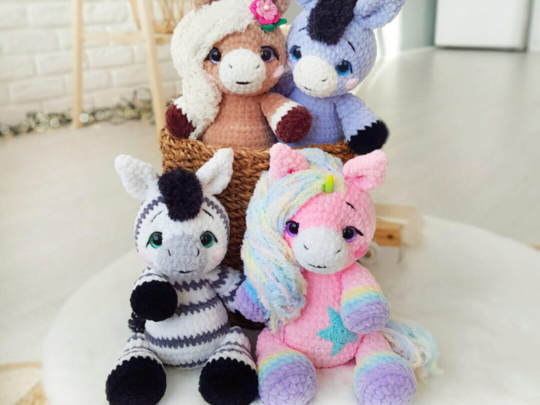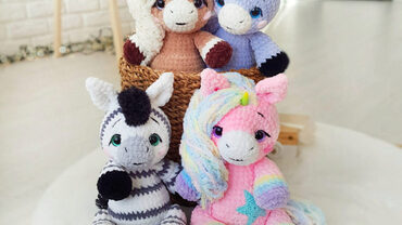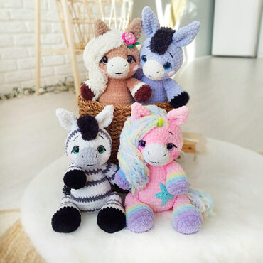 ► включает в себя описание вязания: ослика, лошадки, зебры