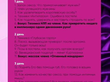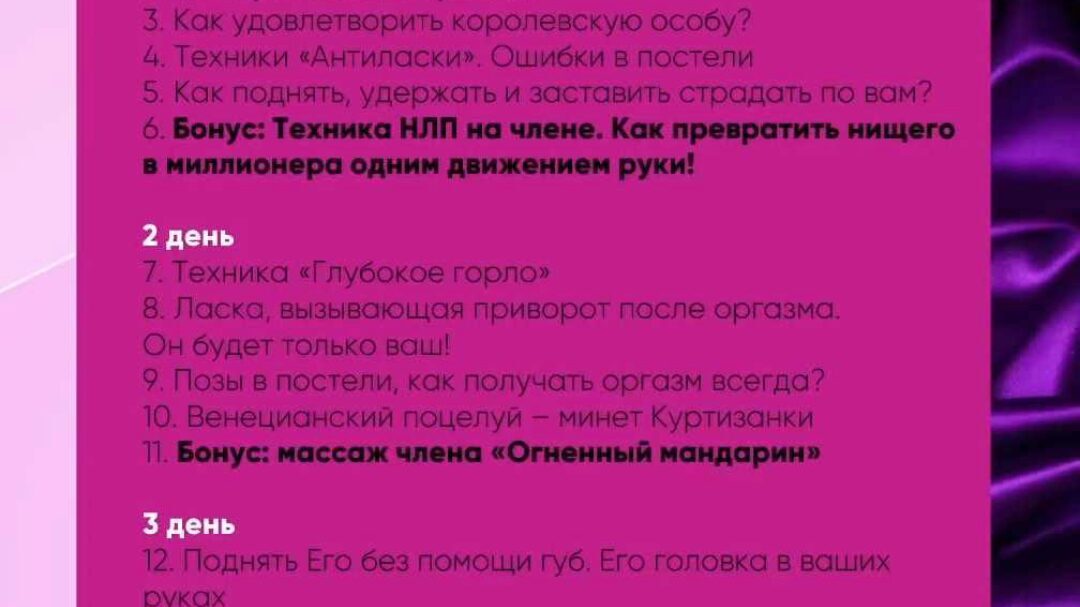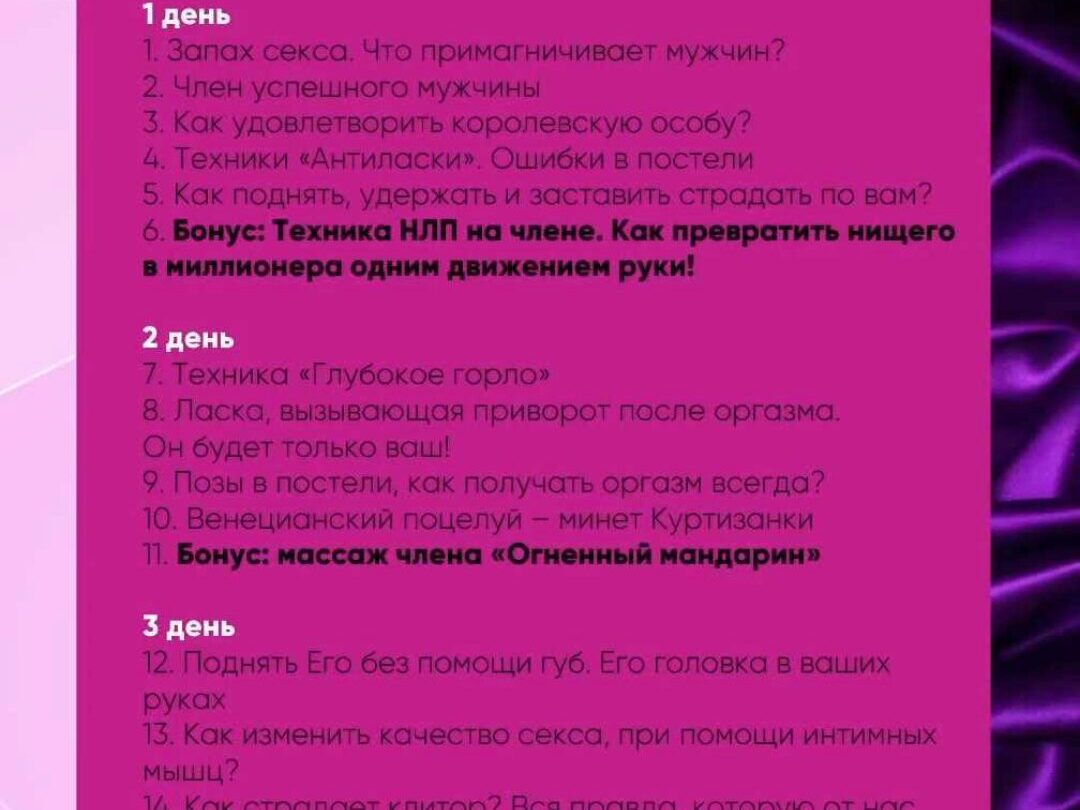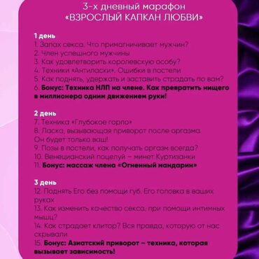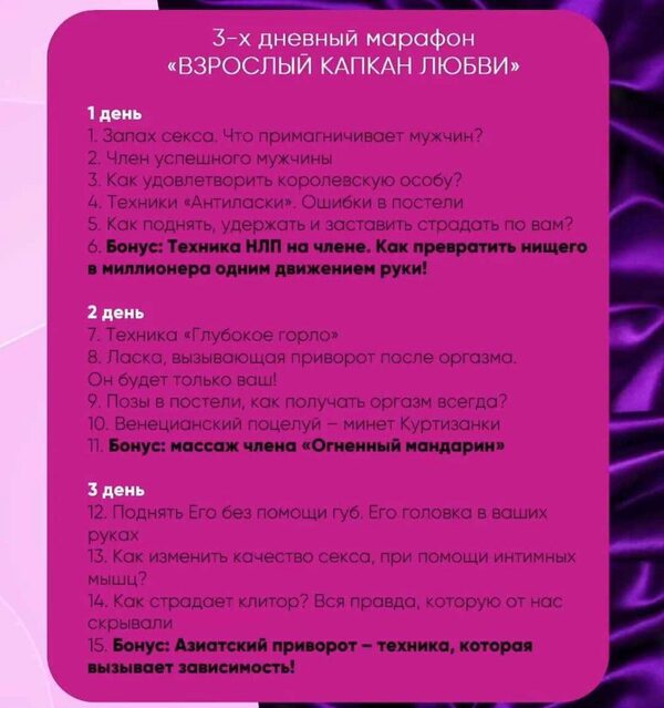 Вы получите: запись марафона +Бонус: Привлекающим женщинам Первый секс. Как сделать, чтобы он не оказался последним? Как правильно почувствовать, что пора… Как красиво уходить от интимной темы разговора Замужним женщинам Секреты возвращения чувства влюблённости, как в начале отношений Правила