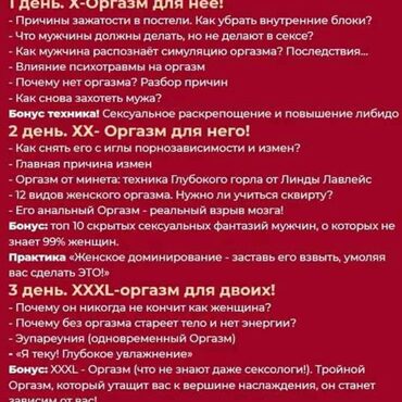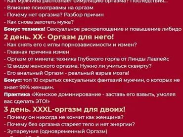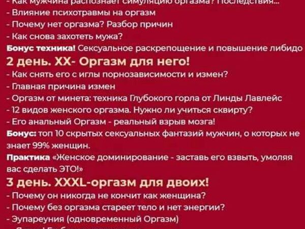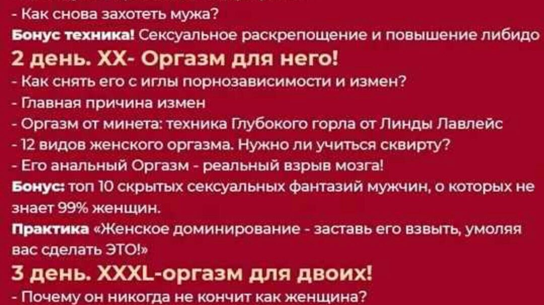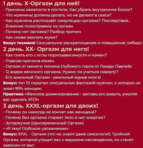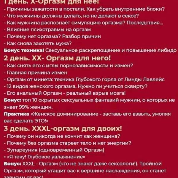 3х дневный марафон. Вы сделали правильный шаг в направлении своего совершенствования. 1 день Запах секса. Что примагничивает мужчин? Член успешного мужчины. Как удовлетворить королевскую особу? Техники Антиласки. Ошибки в постели Как поднять, удержать и заставить страдать по вам? Бонус: техника НЛП