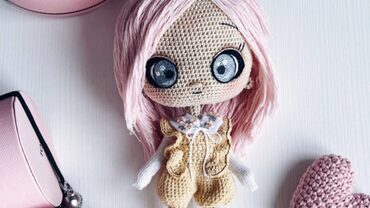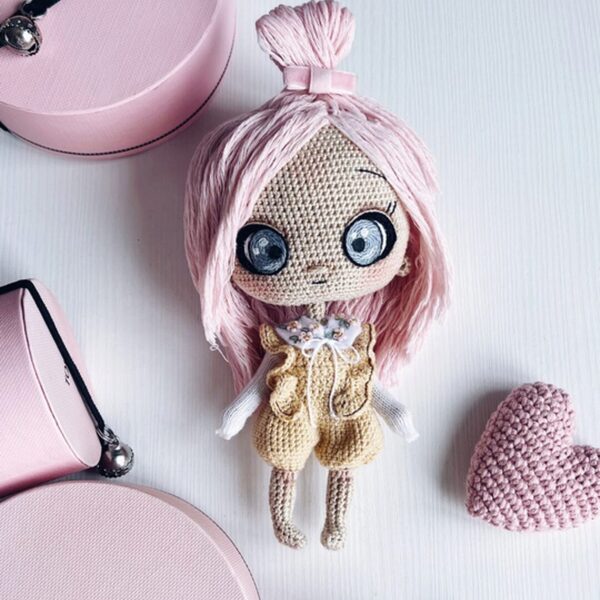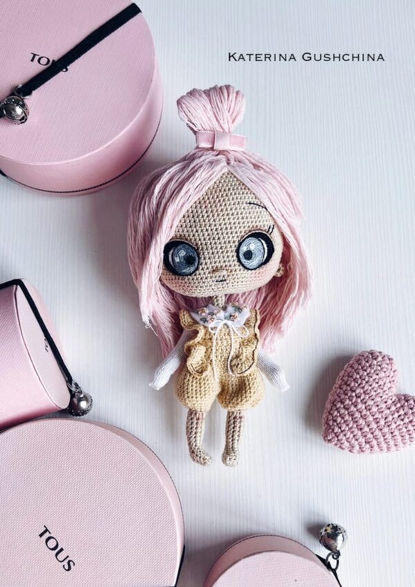 МК в формате pdf. В МК входит вязание тела (ножка фигурная), моделирование личика, прическа. Пошаговое описание наряда, вышивки, ободочка и горшка с цветами. Вставка каркаса и тонировка.
