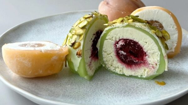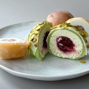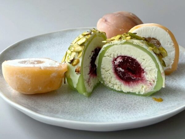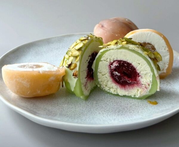 Основа начинки моти «Фисташка-малина» - фисташковый крем на основе творожного сыра, центр - малиновое конфи. Оформление: глазурь Гурмэ, лепестки фисташки. Технологическая карта не включает в себя тесто для моти. Технологическая карта в текстовом формате PDF.