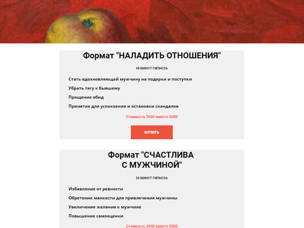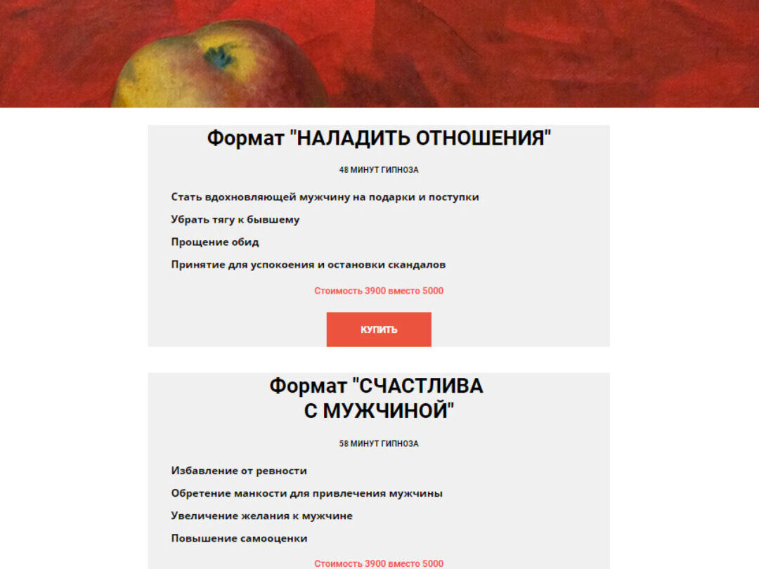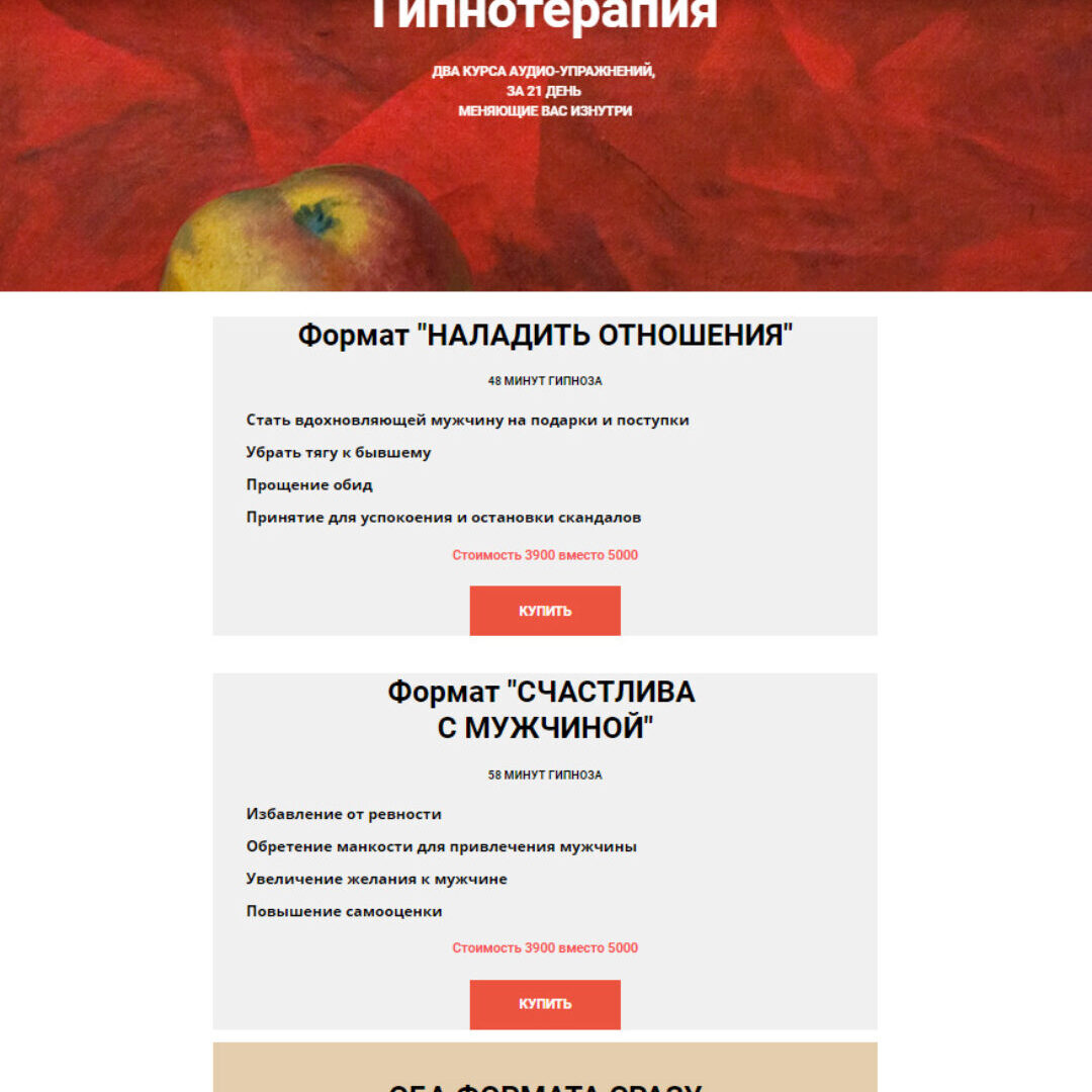 1 ЧАС 42 МИНУТЫ Кодирование от набора лишнего веса Избавление от психогенетики полноты Гипнотерапия для поддержания результата Аура привлекательности для мужчин Гипноз от тяги к еде - чтобы не сидеть на диетах, а просто не хотелось того, что не нужно На изменение обмена веществ - чтобы сжигать