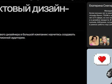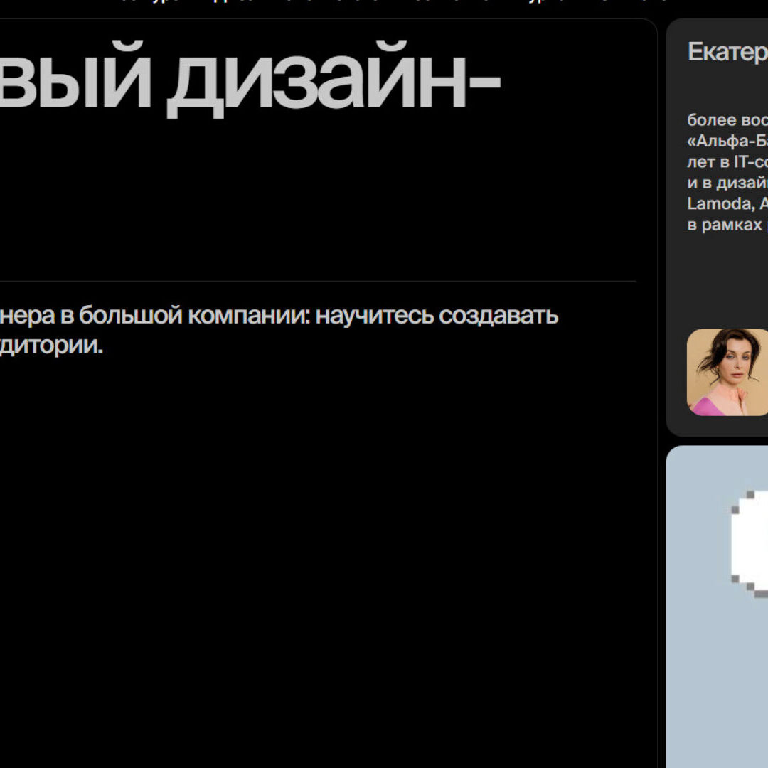На курсе вы разберетесь в дизайн-процессах больших IT-компаний — таких, как «Яндекс», Mail.ru, «Авито», Lamoda и AliExpress. Получите опыт работы дизайнером продукта и все навыки, необходимые для работы в большой компании в условиях изменяющегося мира и T-shape-развития специалистов. Навыки, которые помогут вам стать в продукте своим. Продуктовый дизайнер — специалист, который может полноценно принимать решения, влиять на бизнес и оценивать результат своей работы на всех этапах. На этом курсе мы не учим рисовать макеты или создавать дизайн-системы, а учим целостному продуктовому подходу. Вы создадите продукт или фичу для решения целей компании, проведете исследование, спроектируете и просчитаете с аналитиками продуктовые эксперименты, внедрите OKR своего направления для синхронизации команды, научитесь растить метрики в условиях любых ограничений, проведете дизайн-спринт и организуете командный performance review. Для работы можно взять продуктовую задачу из своей практики или выбрать реальный бриф от экспертов курса. Программа рассчитана на дизайнеров с опытом: в студиях, на фрилансе или в небольших продуктах. В конце обучения вы получите продуктовый кейс в портфолио, а лучшие студенты — рекомендации от преподавательниц курса для будущих работодателей.