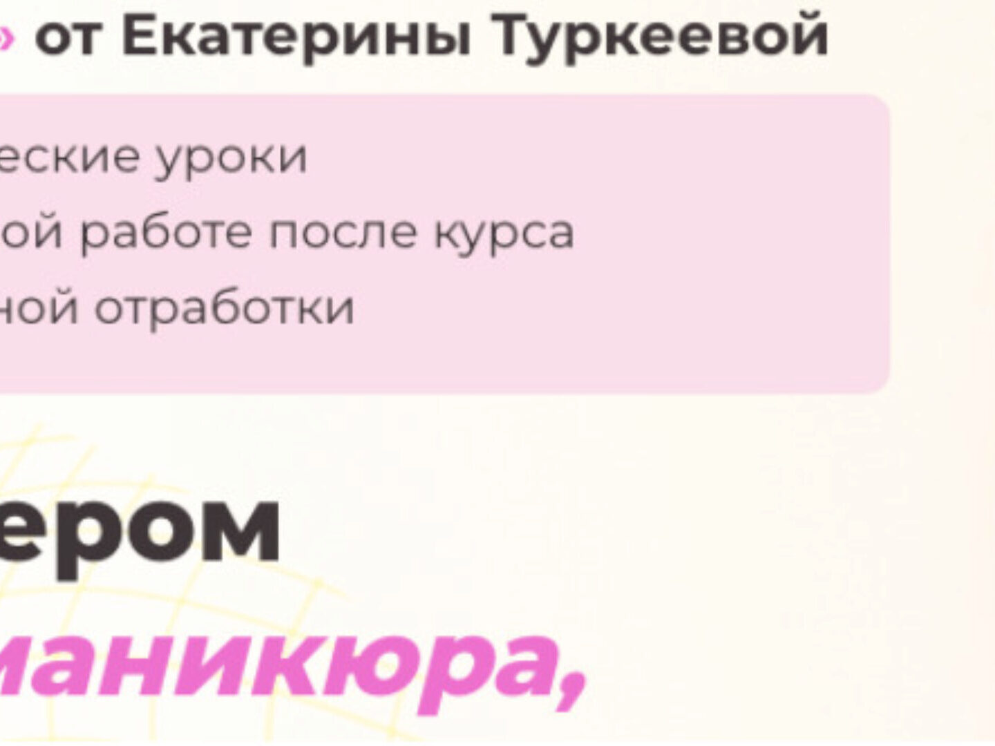 После мини-курсов вы: Научитесь безошибочно выбирать технику для каждого клиента; Устраните пробелы в ваших слабых зонах процедуры; Повысите качество своих услуг и сможете поднять цены; Начнете делать маникюр быстрее и больше времени уделять себе; Узнаете все правила и фишки маникюра Анны