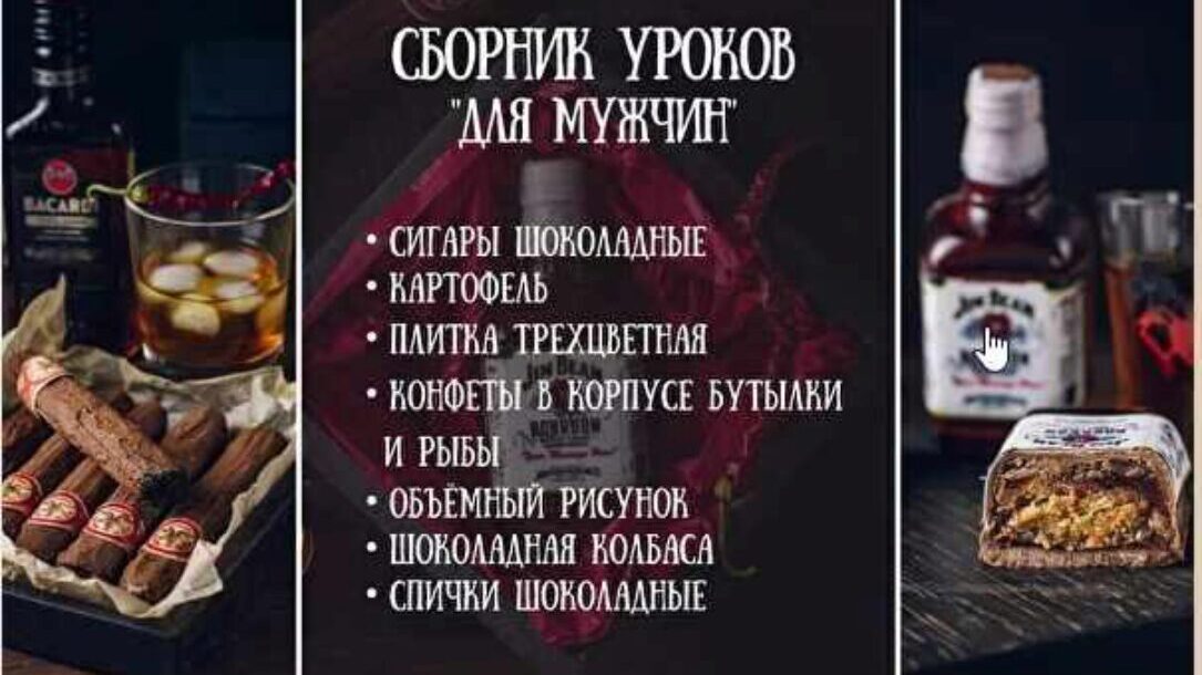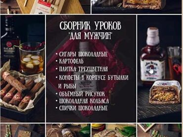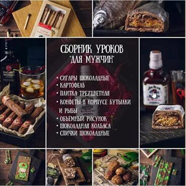 Все 3 лота ЛОТ №1 Мужской сборник Курс «Школа» В сборник «Мужчинам» входят уроки: «Шоколадные пельмешки» Сигары ШОКОЛАДНЫЕ Видеоурок «Картофель» Плитка трехцветная Конфеты в корпусе бутылки JIM BIM и рыба «Шоколадная колбаса» В сборнике «Школа» следующие уроки: Видеоурок «Открытка» Видеоурок