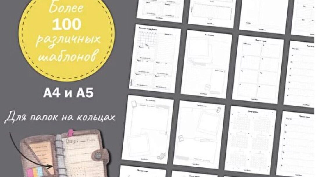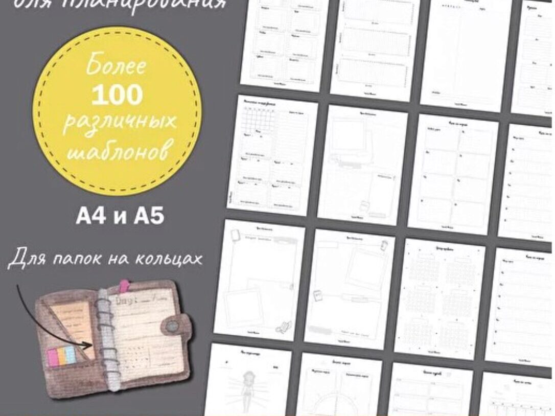 Здесь есть разные варианты плана на год, три месяца, месяц, неделю и день. А также варианты дневников для саморефлексии, разные варианты трекеров привычек, настроения и энергии