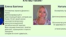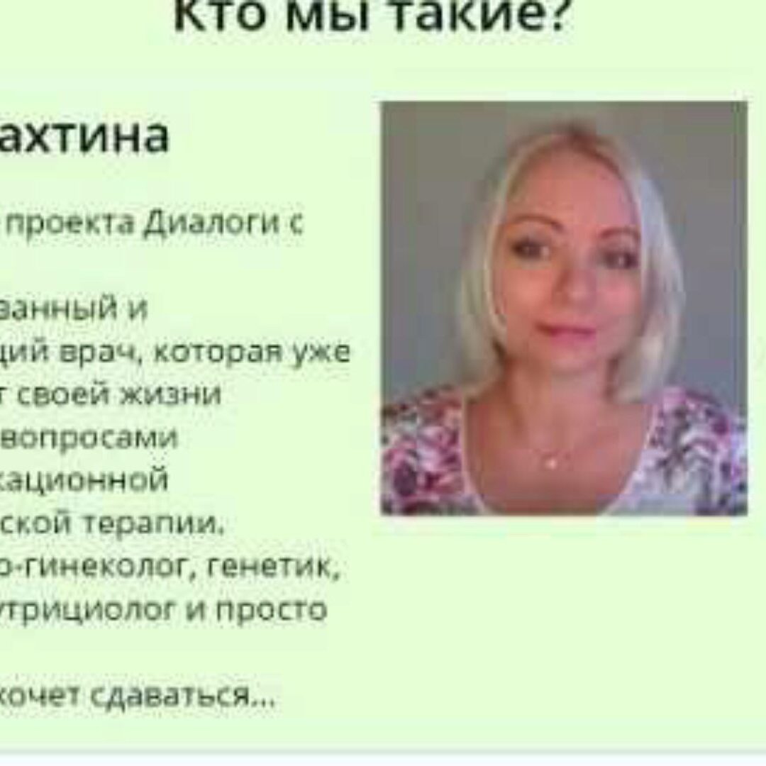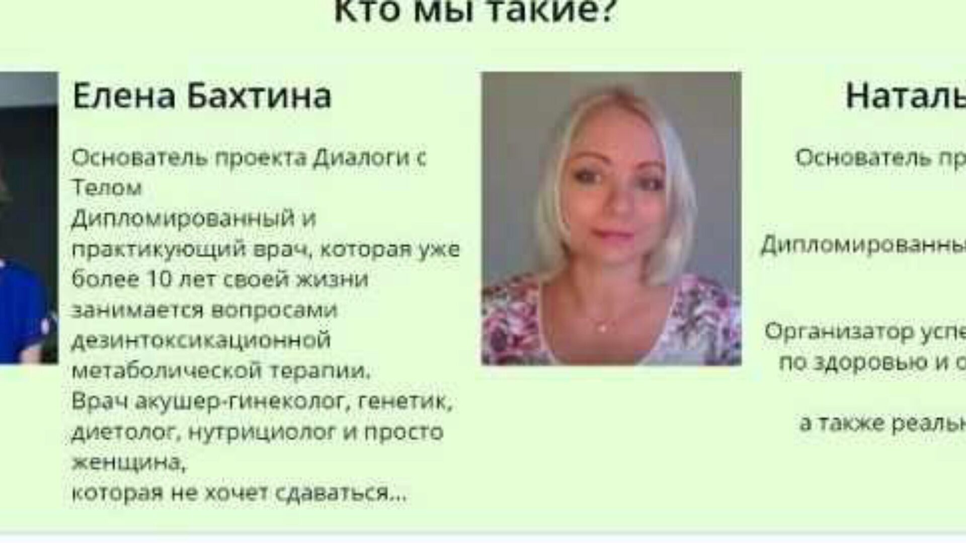 Елена Бахтина - основатель проекта Диалоги с Телом, дипломированный и практикующий врач, которая уже более 10 лет своей жизни занимается вопросами дезинтоксикационной метаболической терапии. Врач акушер-гинеколог, генетик, диетолог, нутрициолог и просто женщина, которая не хочет сдаваться...